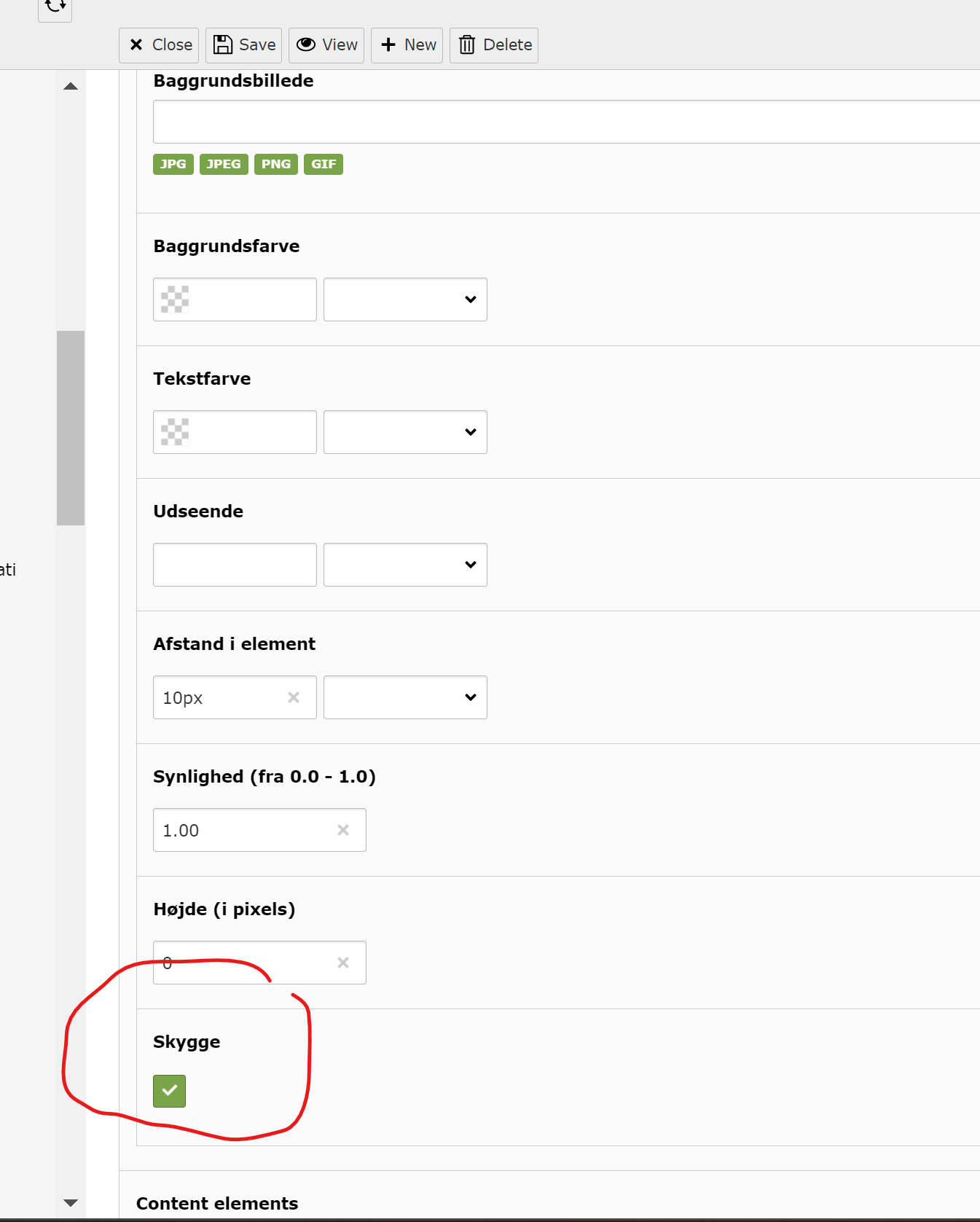 Det gør man i elementet "kasse". Samme sted, hvor man sætter farven på en boks. Under farvevælgeren og der hvor man sætter afstande og mellemrum, er der en tjekbok hvor man kan sætte skygge på. Eksemplet ses her og på "knapperne" nedenfor.